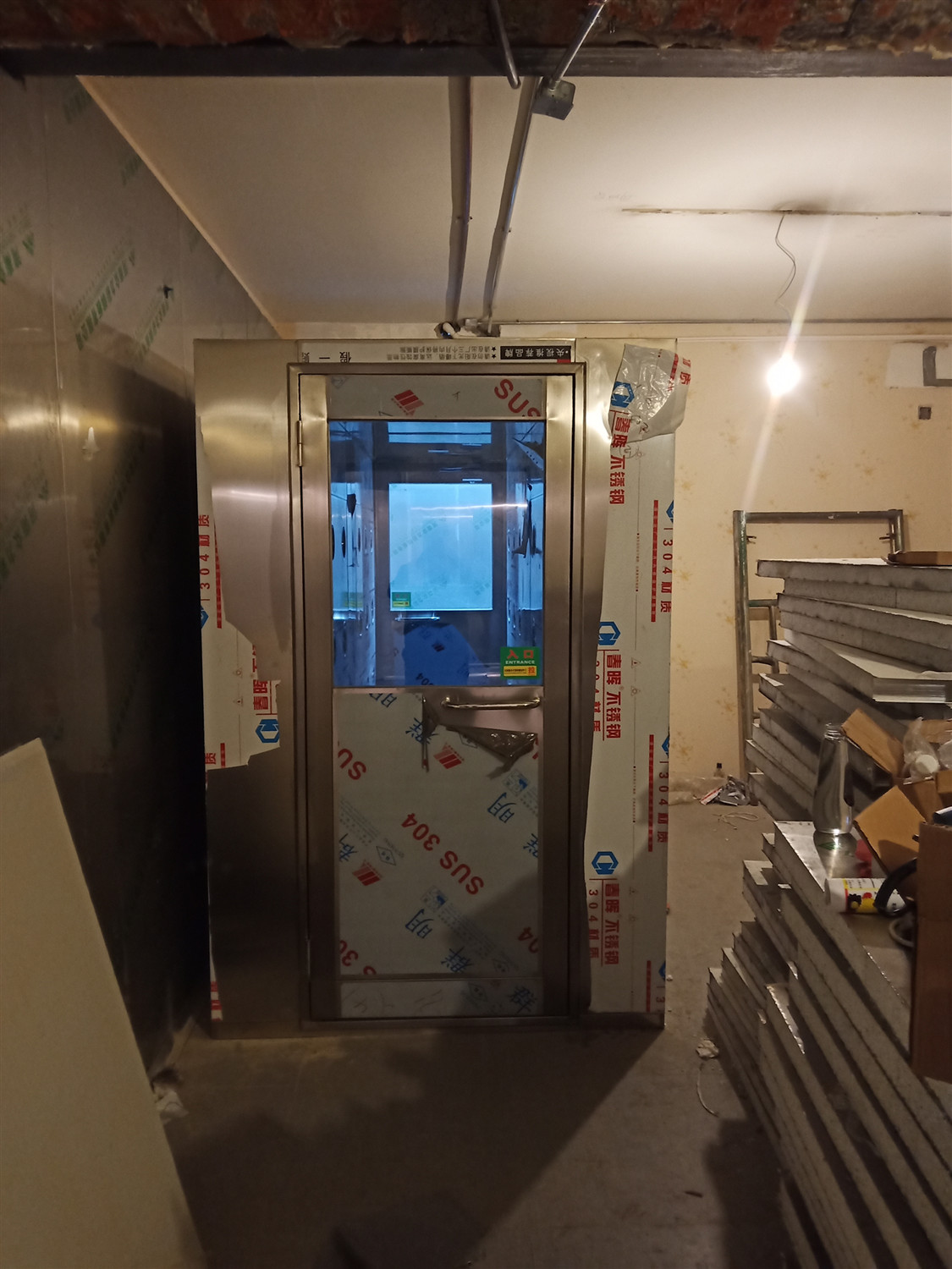 然后待風(fēng)淋人員進(jìn)入內(nèi)更衣室,穿戴好凈化無塵衣、帽、口罩、手套準(zhǔn)備進(jìn)入風(fēng)淋室。